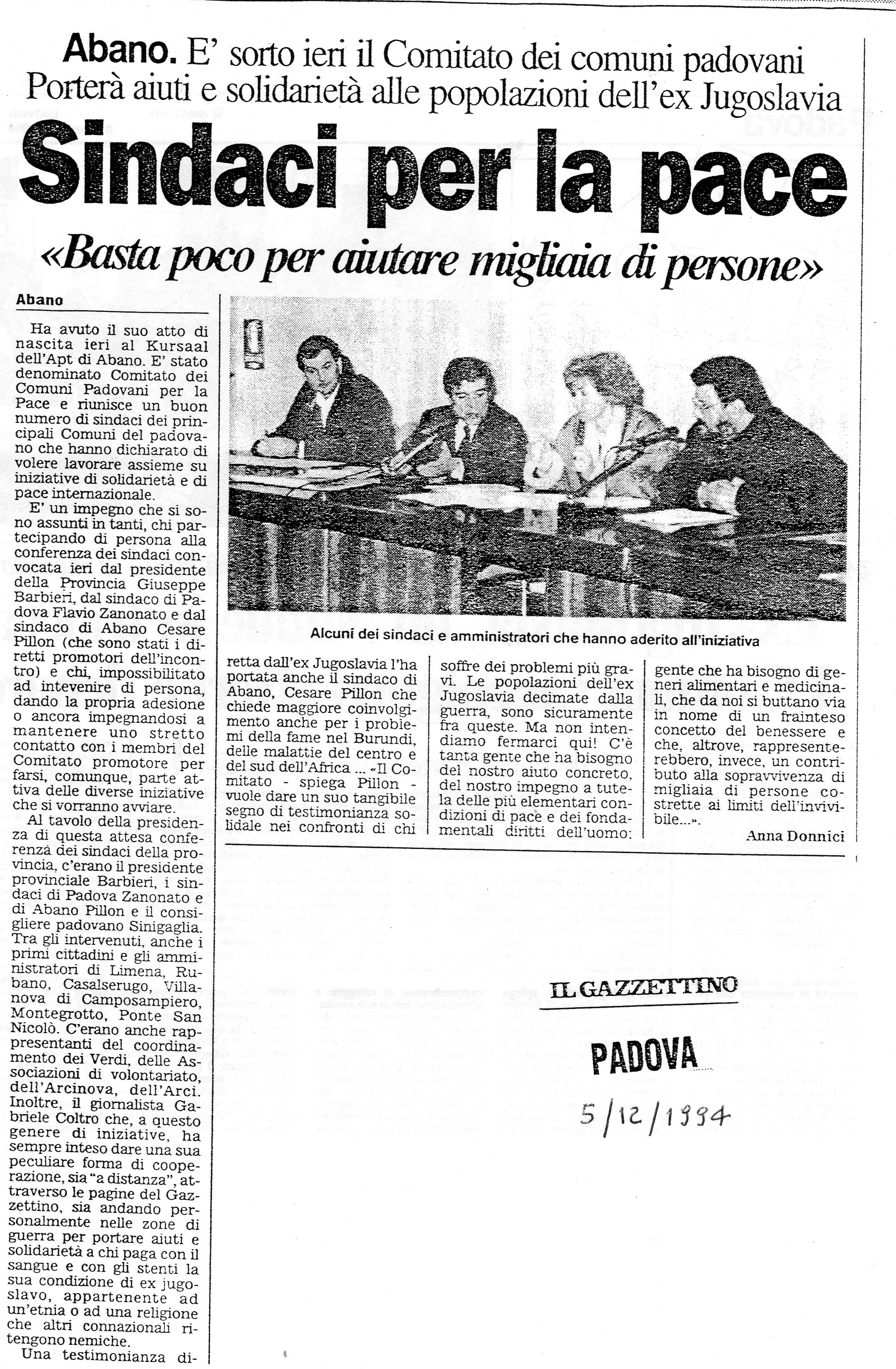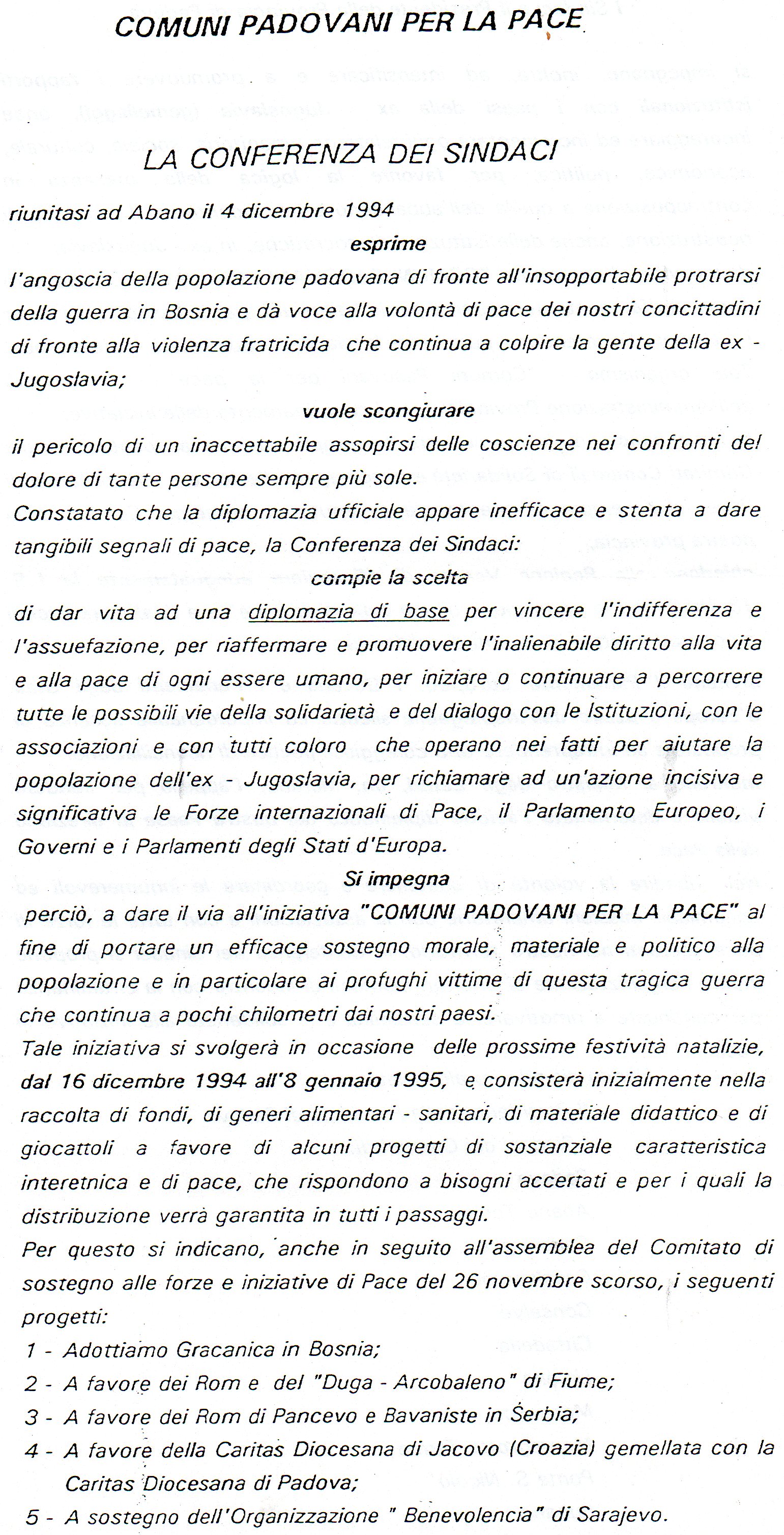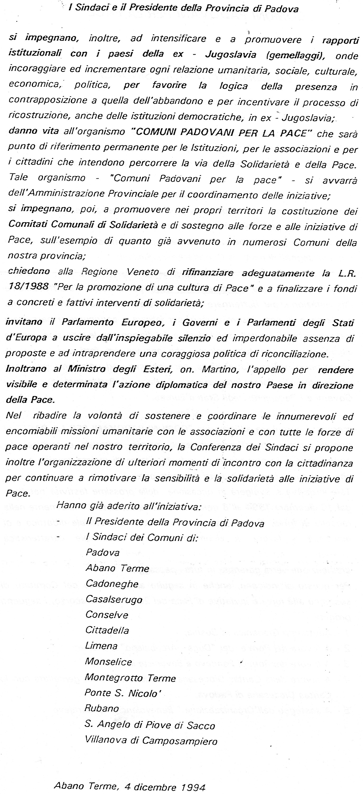 Nel dicembre 1994, su iniziativa del Comitato di Sostegno alle Forze ed Iniziative di Pace, 13 Comuni e la Provincia di Padova hanno costituito il "Comitato dei Comuni Padovani per la Pace" allo scopo di sostenere e coordinare le attività di solidarietà con le popolazioni della ex Jugoslavia che si stavano attuando in tutto il territorio.
