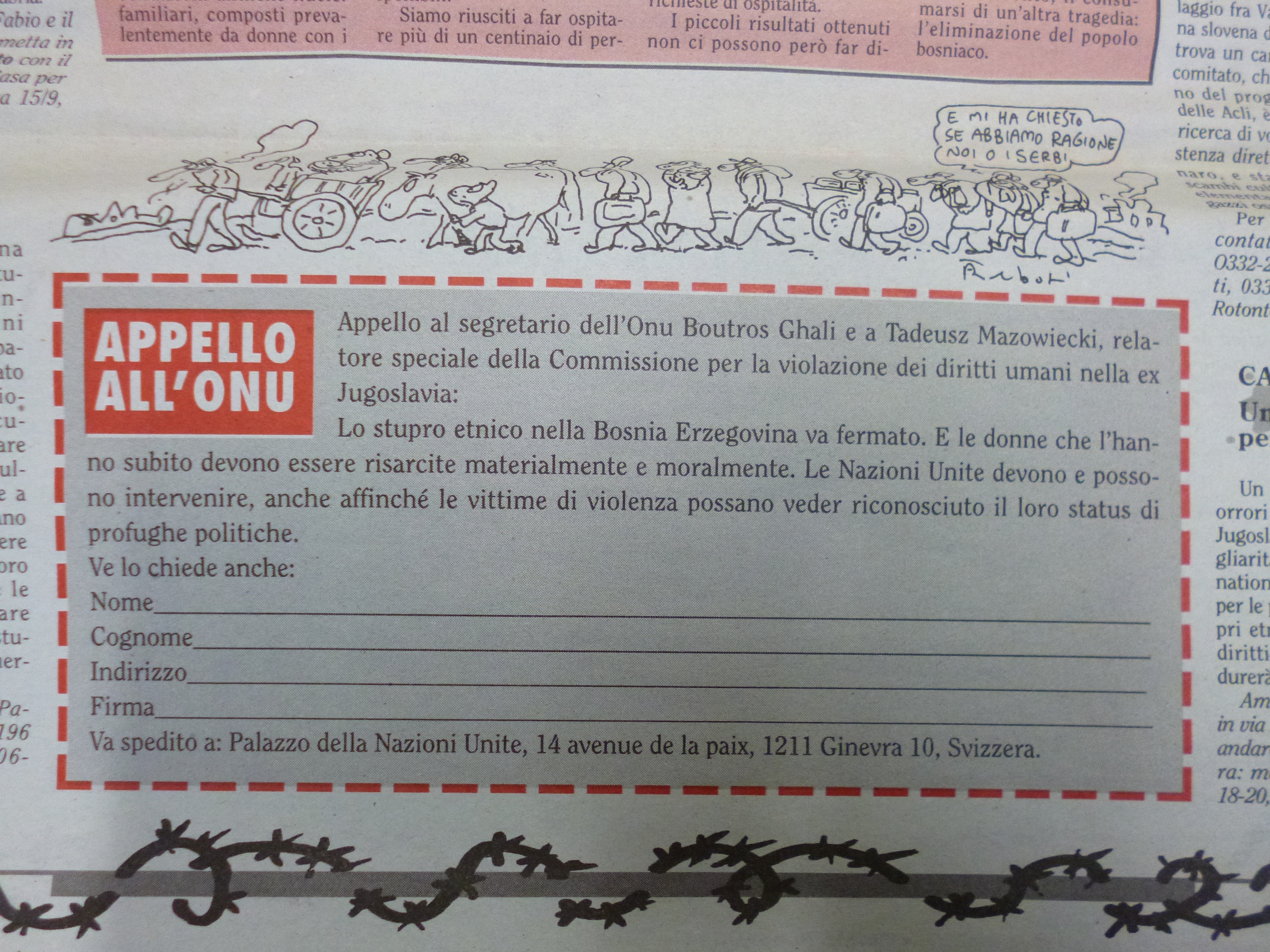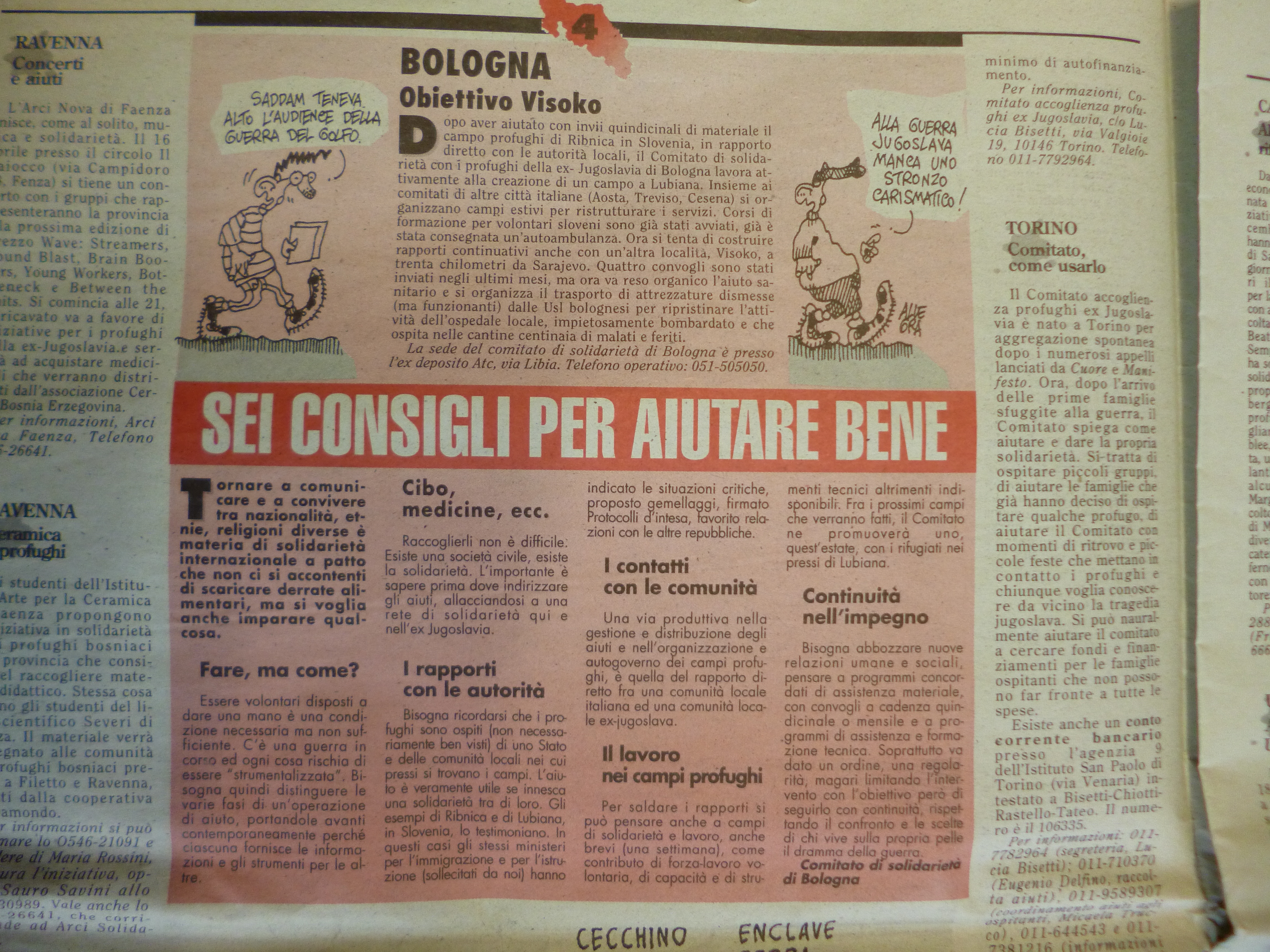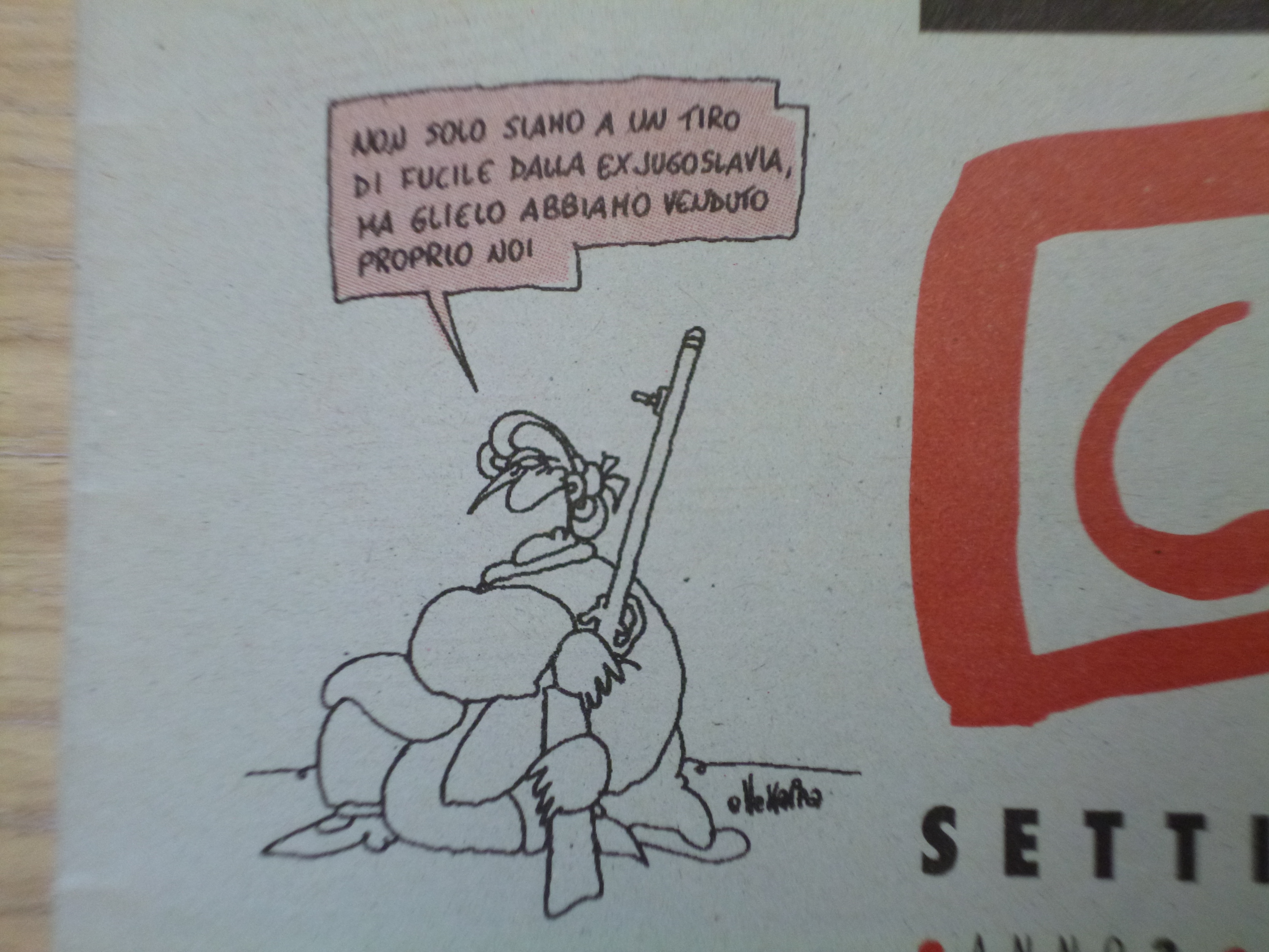 Copia del settimanale satirico Cuore interamente dedicata alla guerra in Jugoslavia. Oltre ai testi e le vignette di giornalisti e diversi autori, vengono segnalate le tante iniziative sui diversi territori portate avanti dai movimenti di solidarietà in Italia.