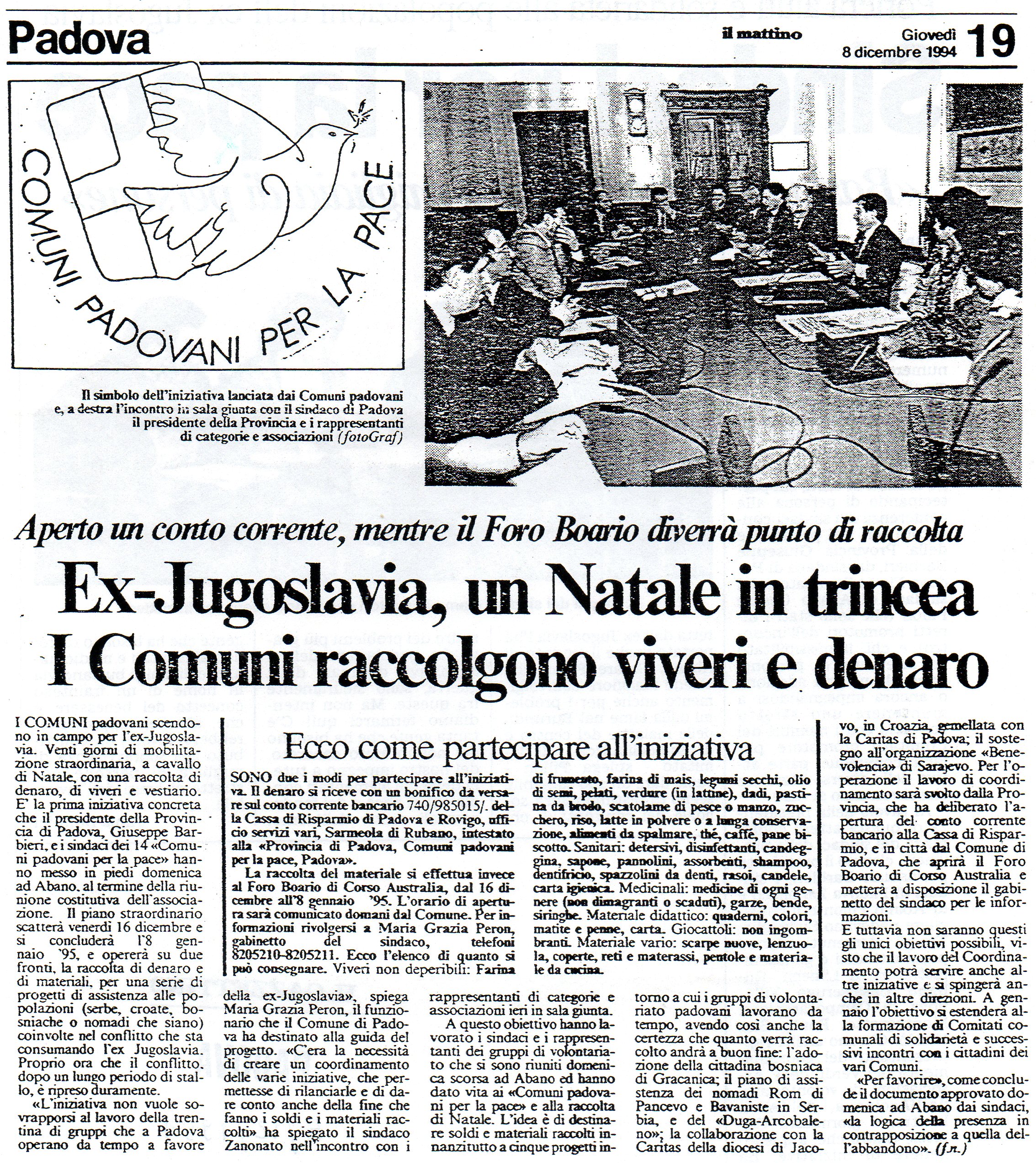 Nel dicembre 1994, su iniziativa del Comitato di Sostegno alle Forze ed Iniziative di Pace, 13 Comuni e la Provincia di Padova hanno costituito il "Comitato dei Comuni Padovani per la Pace" allo scopo di sostenere e coordinare le attività di solidarietà con le popolazioni della ex Jugoslavia che si stavano attuando in tutto il territorio.