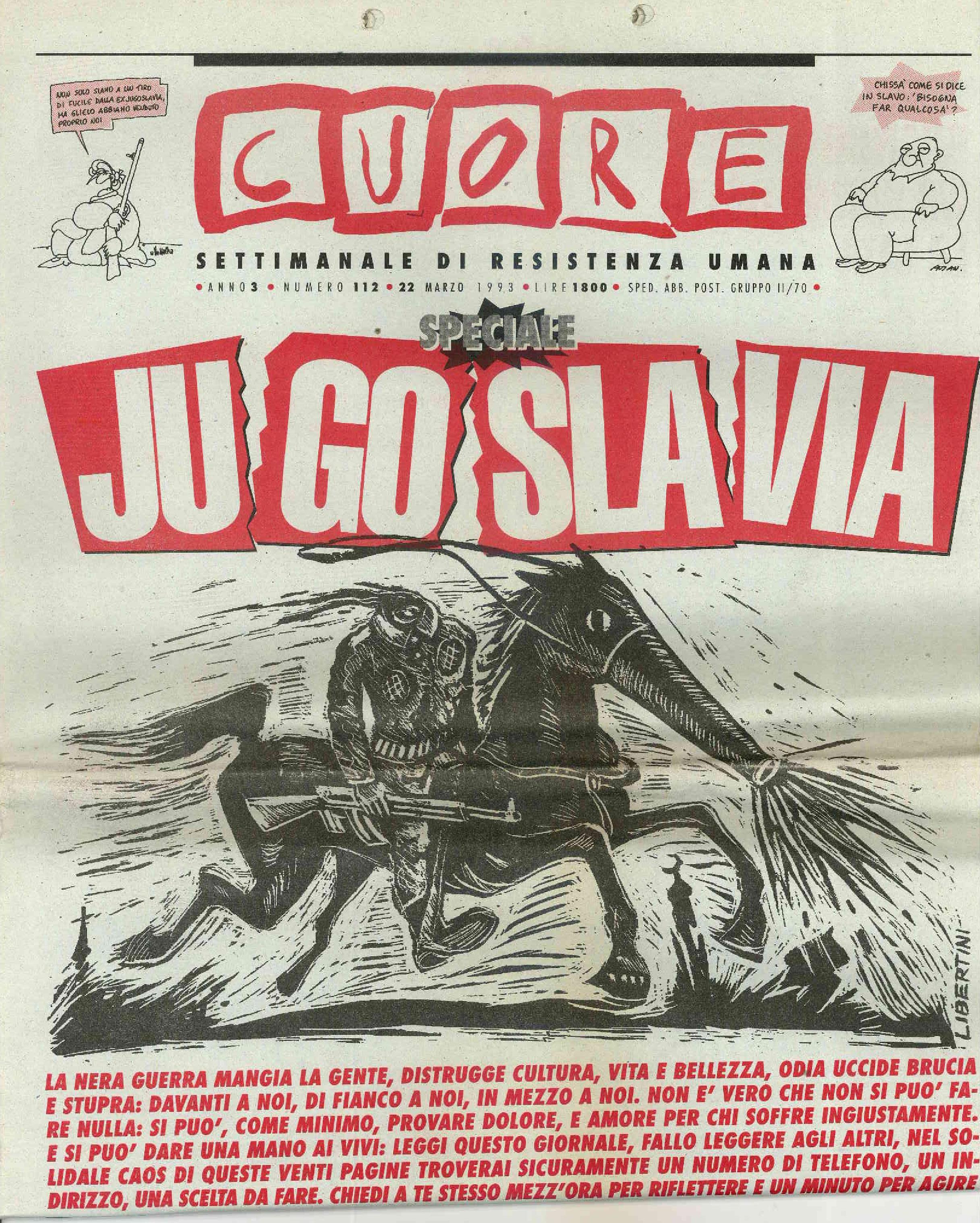 Copia del settimanale satirico Cuore interamente dedicata alla guerra in Jugoslavia. Oltre ai testi e le vignette di giornalisti e diversi autori, vengono segnalate le tante iniziative sui diversi territori portate avanti dai movimenti di solidarietà in Italia.